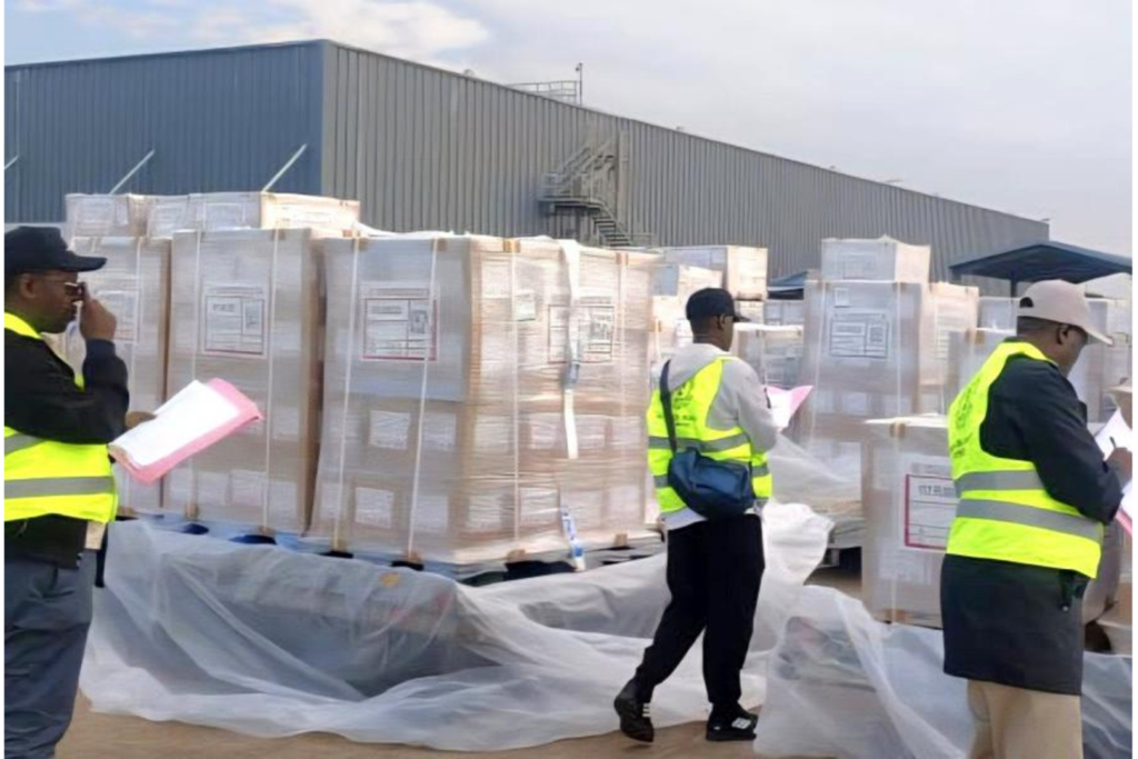 Under tight security, the pallets, sealed and wrapped, were offloaded from a cargo aircraft in the presence of EC officials, representatives of political parties, security agencies, and the media, a gesture aimed at reinforcing transparency amid lingering public mistrust rooted in disputed past elections.