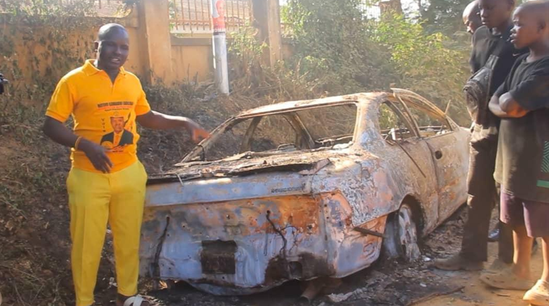 Kamaadi Matovu, a boda boda rider and Butego Ward councillor aspirant, claims his Toyota Carina, registration number UAD 438F, caught fire after he left it by the roadside on Monday evening when it developed a mechanical problem during a mobilisation drive for President Museveni.