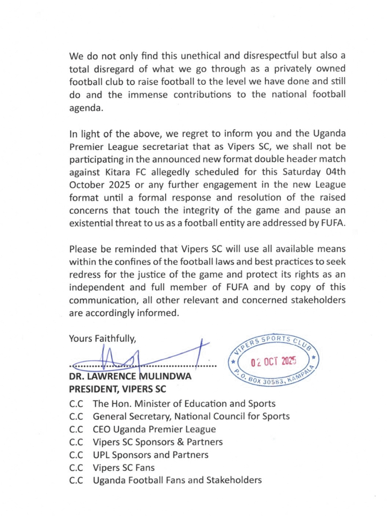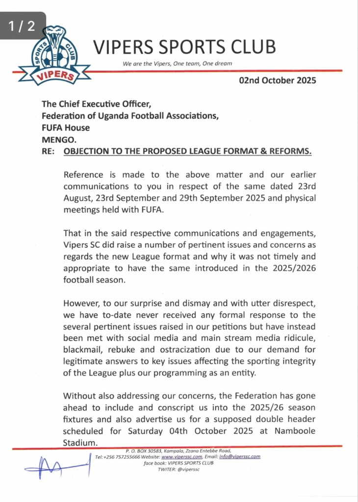 Vipers Sports Club has officially withdrawn from its scheduled Uganda Premier League (UPL) fixture against Kitara FC, citing unresolved concerns over the newly proposed double-header league format. The announcement, made on October 2 via the club’s official website and reinforced through formal letters to key stakeholders, marks a dramatic escalation in the ongoing standoff between the Kitende-based giants and the Federation of Uganda Football Associations (FUFA).